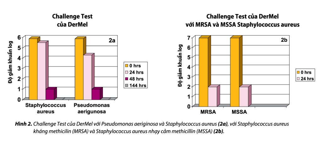 Challenge Test được thực hiện với mật ong DerMel để xác định hiệu quả diệt khuẩn của DerMel đối với hai loại vi khuẩn Staphylococcus aureus và Pseudomonas aerigunosa (Hình 2a). Challenge Test được thực hiện theo hướng dẫn của Dược điển Châu Âu, bao gồm 1-10 triệu vi khuẩn được thêm vào mỗi gram mật ong. Các mẫu được lấy ở các khoảng thời gian khác nhau, sau đó sẽ được phân tích để xác định số lượng vi khuẩn còn sống sót.